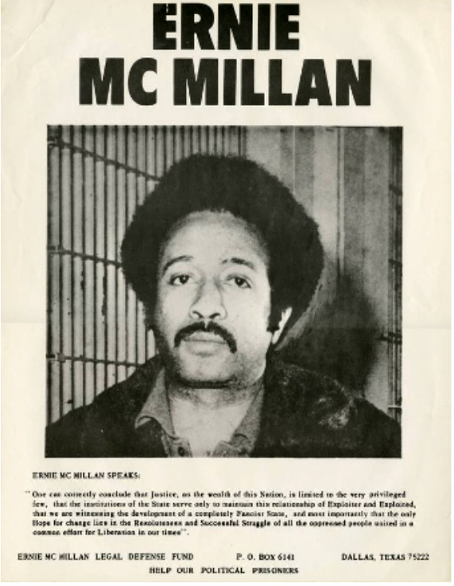 Ernie McMillin. Legal Defense Fund Poster. 1968. "One can correctly conclude that Justice, as the wealth of this Nation, is limited to the very privileged few, that the institutions of the State serve only to maintain this relationship of Exploiter and Exploited, that we are witnessing the development of a completely Fascist State, and most importatntly that only Hope for change lies in the Resoluteness and Successful Struggle of all the oppressed people united in a common effort for Liberation in our times." |